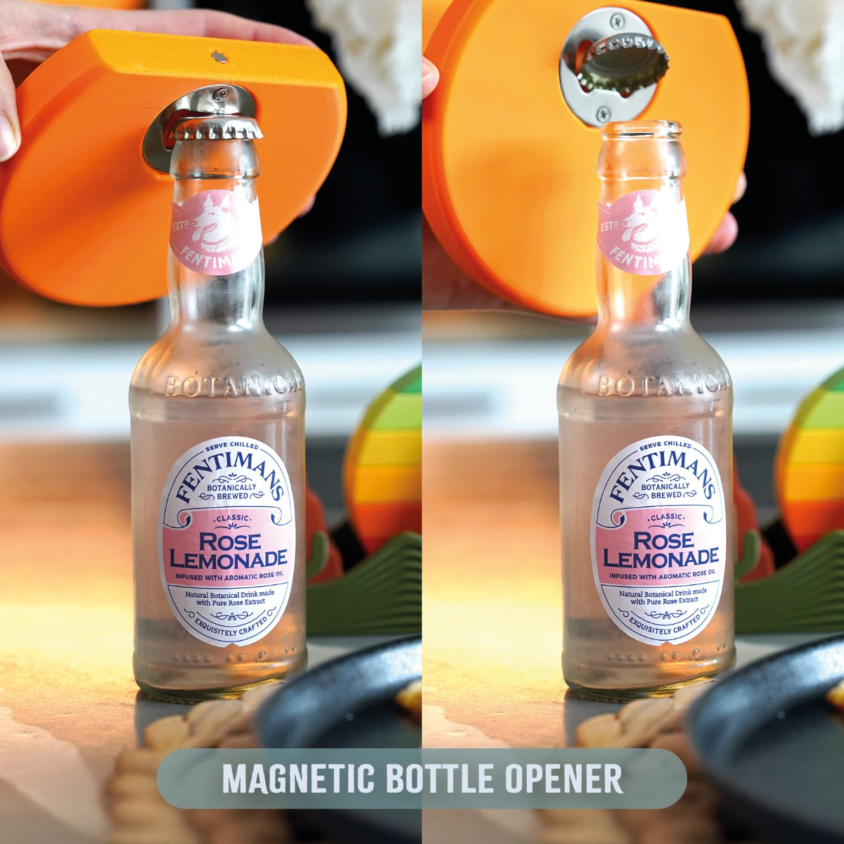 A magnetic sun-shaped bottle opener—stylish and strong.