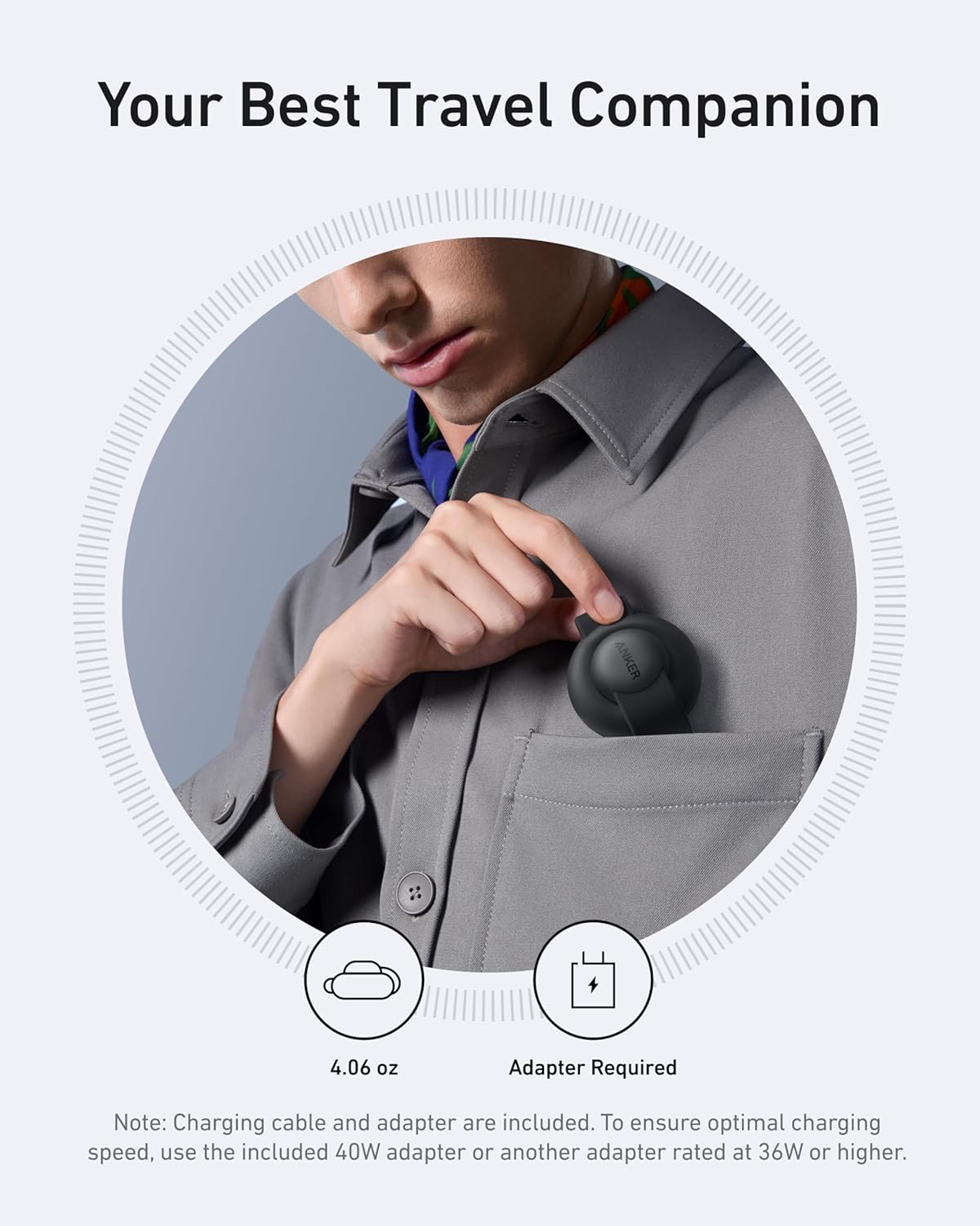 - Connection & Power: Features a USB Type-C port and includes a 25W USB-C wall charger with a charging cable. Supports wide voltage input (100-240V AC) for global travel use.