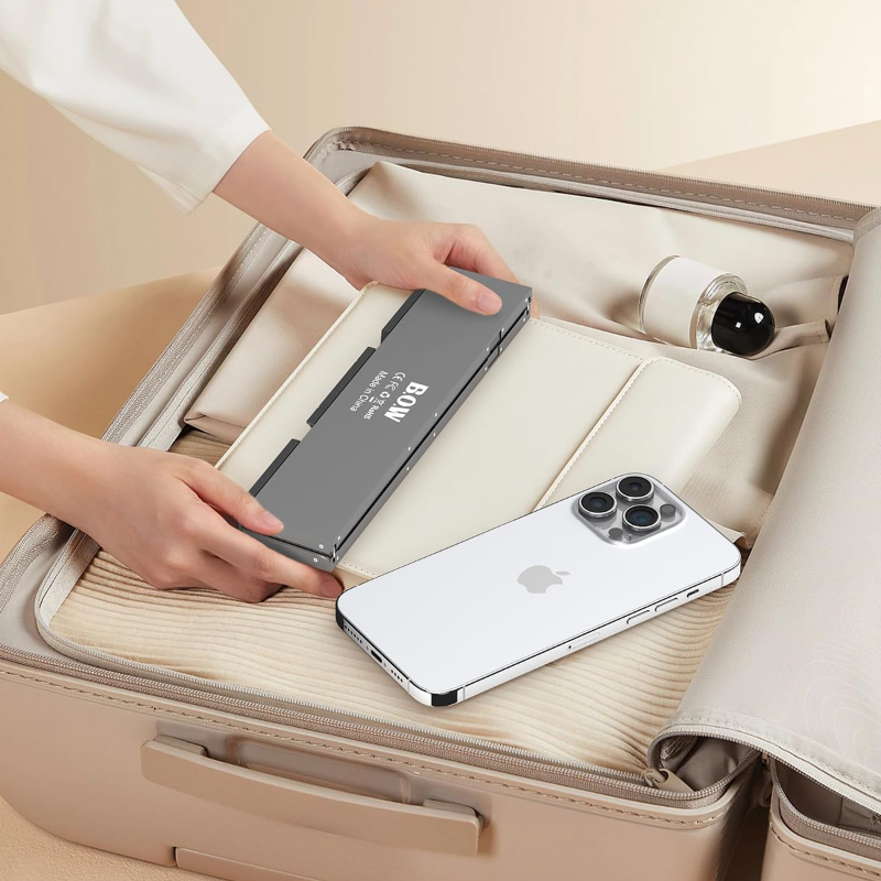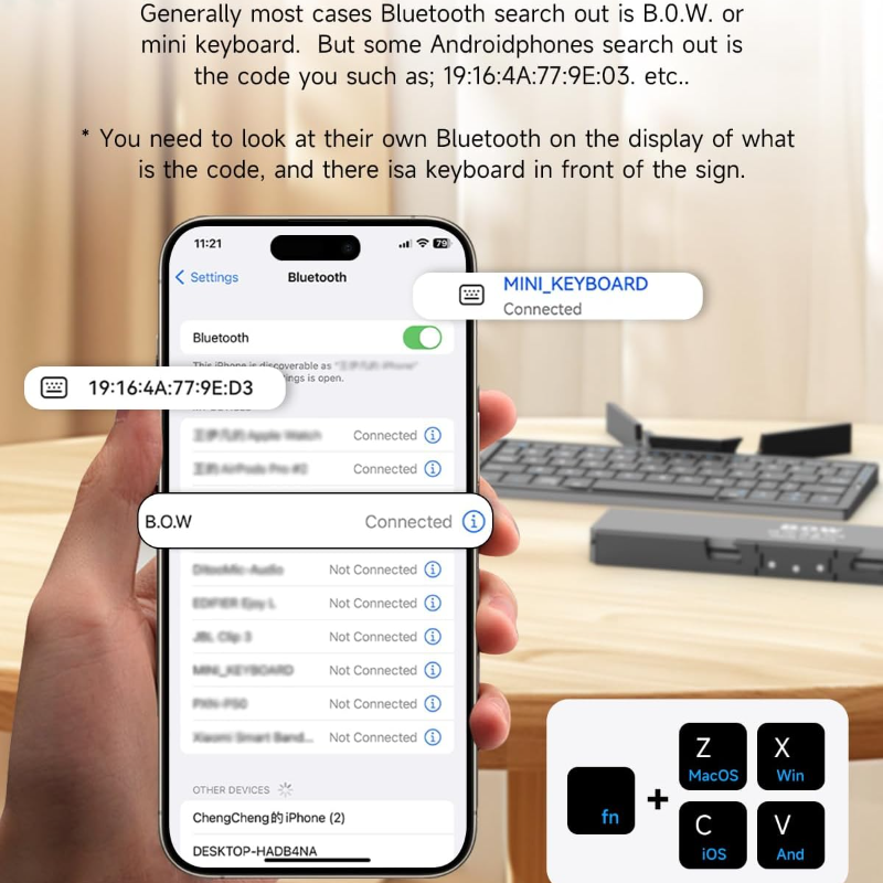 This ultra-compact folding keyboard features a horizontal fold design and 60 minimalist keys, perfect for students and travelers. Built with a Broadcom chip, it supports seamless Bluetooth connection across iOS, Android, and Windows devices.